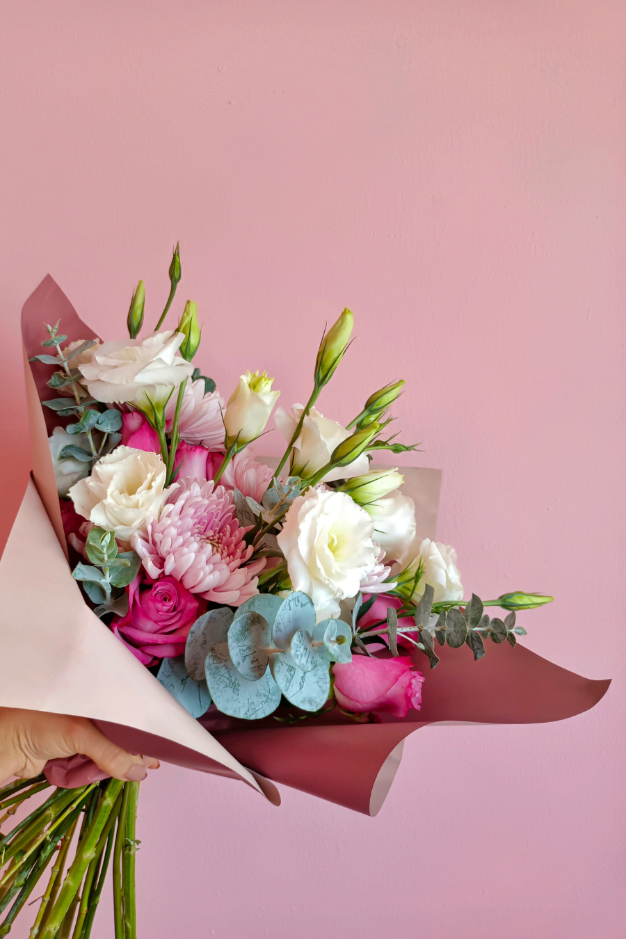 Bouquet de 24 Rosas , Lisianthus, Flor de complemento y follaje. (El color de las flores y las flores de complemento pueden variar dependiendo la temporada)